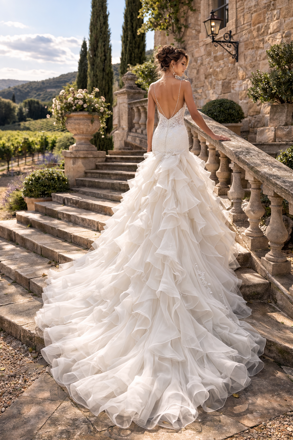 Cette forme sirène et cette dentelle brodée de sequins transparent sauront vous sublimer pour le jour J. Sa traine fera de vous la princesse du jour. Sa coupe mettra votre taille en valeur. Son large dos nu vous offrira une ligne de dos spectaculaire et vous permettra également de porter un bijoux de dos. Les volants de cette robe de mariée sirène vous donne un effet de légèreté.